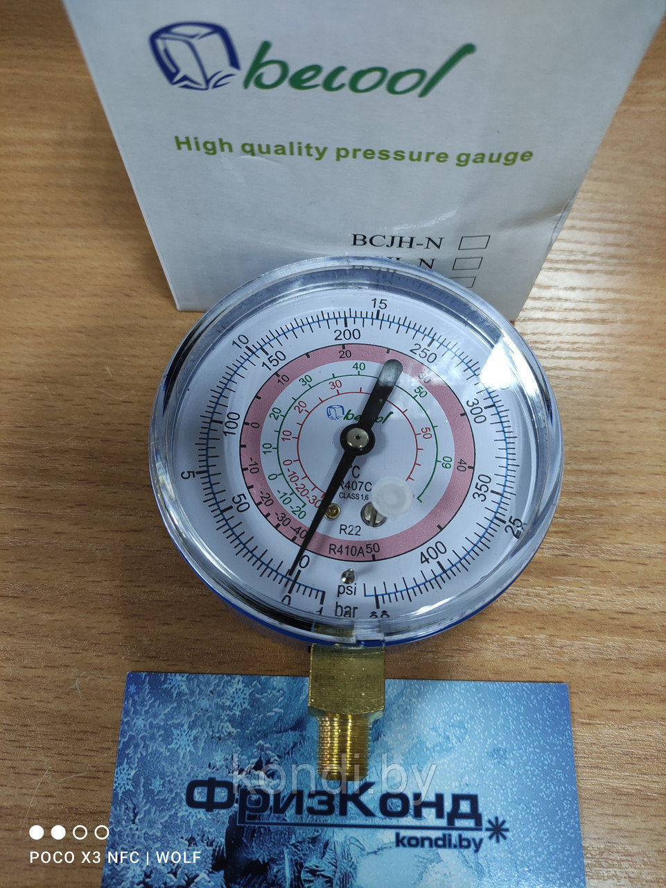 Корпус мановакуумметра BCOL-N изготовлен из окрашенной методом порошковой окраски в синий цвет стали. На шкалу мановакуумметра нанесены температурные шкалы R22, R407С, R410A, имеется юстировочный винт измерительного механизма.
